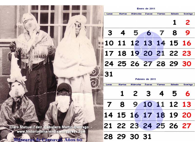 - Enero y febrero (2011): Por su puesto y como no podía ser de otra forma, la imagen estaba dedicada a las máscaras callejeras del Carnaval de Herencia, hoy fiesta de Interés Turístico Regional, entre otros motivos por no haber dejado de celebrarse en ningún momento, ni siquiera cuando estuvo prohibida durante el franquismo. Para muestra, esta imagen tomada en plena calle durante los años 60.