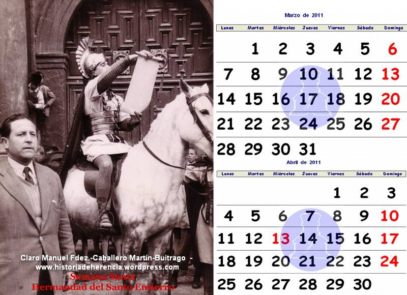 - Marzo y abril (2011):Otra de las fiestas más importantes de la localidad es sin duda la Semana Santa, por ello, la imagen elegida para ilustrar estos meses fue la de los antiguos romanos de la Hermandad del Santo Entierro, leyendo su «pregón» delante de la puerta de la iglesia parroquial.
