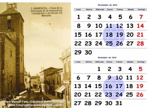 CALENDARIO Septiembre Octubre - Taller de Historia Local de la universidad Popular. Curso 2010-2011 - Noviembre y diciembre (2010):En esta ocasión, y celebrándose el 8 de diciembre la fiesta de la «Inmaculada Concepción», la imagen elegida fue una fotografía de los años 3o, en la cual se puede ver la parroquia de la «Inmaculada Concepción» y un rincón del mercado.