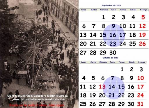 - Septiembre y octubre (2010):El motivo elegido fue la feria y fiestas de la localidad, celebradas entorno al 24 de septiembre en honor a la Virgen de las Mercedes. La fotografía recogía una instantánea de la feria situada entonces (1950) en la calle Colón, junto a la iglesia conventual de la Merced.