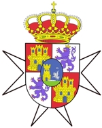 “Escudo cuartelado en cruz. Primero y Cuarta de gules castillo de oro mazonado de sable y aclarado de azur; Segundo y Tercero, de plata león rampante de púrpura armado, uñado y linguado de gules y coronado de oro. Escuson ovalado de azur torre de oro mazonado de sable y aclarada de azur, acompañada a siniestra de caballero con armadura y lanza de plata sobre caballo rampante de lo mismo, yacente musulmán de plata, terrado de sinople. Acolado de cruz de San Juan de plata. Al timbre corona real cerrada”.