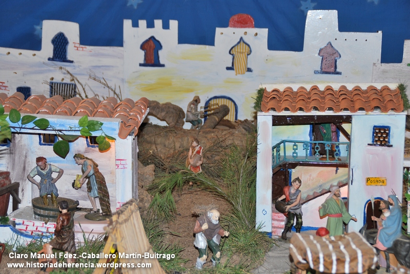 Con unas dimensiones de 3´50 x 13 m., algo más pequeño que en años anteriores, ya que en esta ocasión también ha dispuesto un belén de 3 x 7 m. en la sala de acceso a los multicines de Alcázar de San Juan, es toda una obra de arte realizada con el tensón, cuidado y mimo, que sólo las personas como Jesús pueden atesorar, realizando muchas de las figuras y restaurando aquellas que año a año necesitan de sus cuidados. Entre sus características señalamos el empleo de los más diversos materiales como barro, arcilla, metales, escayolas, poliester, etc.; y la representación de figuras individuales, e igualmente grupales, tanto de pequeño, como de gran formato que reproducen diferentes pasajes bíblicos y, junto a las cuales, también se pueden observar escenas del quehacer humano: costrumbres, oficios, juegos, y un largo etcétera de elementos característicos de La Mancha. La noria, los molinos de viento y de aceite, las tinajas, el pastoreo, la trilla y el arado…, aparecen aquí perfectamente representados, como si de un museo etnográfico en miniatura se tratara. Pero las peculiaridades de este belén no terminan aquí, pues su autor siempre busca sorprender y llamar la atención del espectador, por ello, en algunas ocasiones suele introducir diferentes elementos que reproducen parajes o edificios emblemáticos de su localidad como la plaza de España, la sierra de San Cristobal, o la ermita del Cristo de la Misericordia. Tampoco faltan las figuras móviles o la reproducción más sorprendente de efectos climáticos como la lluvia y la nieve o incluso la plasmación del paso del día a la noche. Es pues, un gran elenco de piezas y curiosidades, como la figura de uno de los reyes magos, realizados en los talleres artesanales de los Hermanos Peño, grandes alfareros de Villafranca de los Caballeros, muy amigos de, permitanme decir, nuestro Chamusca, tal y como se demuestra al visitar su taller donde se puede observar una escultura a tamaño real de Jesús López-Escribano Rodríguez.
