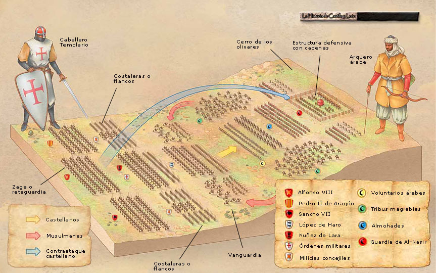 «En el ejército cristiano, unos 12.000 hombres divididos en tres cuerpos, el rey de Aragón mandaba el ala izquierda, correspondiendo el centro al castellano y la derecha al navarro. En primera línea se colocaron las respectivas vanguardias, con los ejércitos y costaneras en el centro y las zagas mandando las retaguardias. Los musulmanes, unos 10 o 12.000, instalaron su campamento en el Cerro de las Viñas, con la infantería al frente y la caballería ligera en los flancos. Detrás se situó la caballería pesada almohade, con la zaga musulmana guardando el campamento del Califa.
