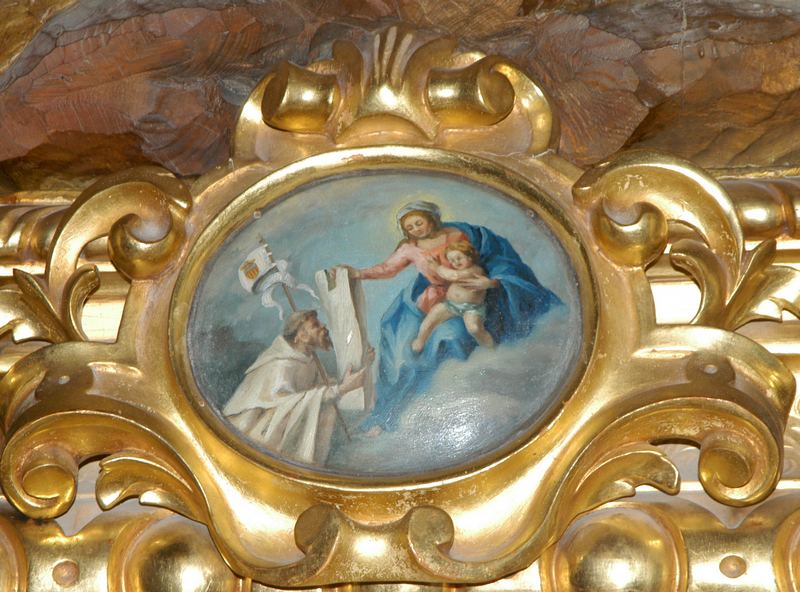 No obstante, sí nos detendremos en analizar la peana que sostiene esta sorprendente imagen, ya que, en su centro, se puede apreciar un medallón donde aparece pintado el momento en el cual la Virgen desciende para entregar personalmente el escapulario de la Orden mercedaria a San Pedro Nolasco.