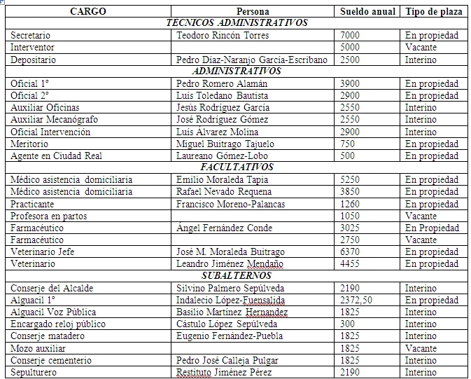 Como ejemplo veamos la plantilla de personal que componía le Ayuntamiento de Herencia en el mes de Septiembre de 1940, siendo alcalde Don Félix García.