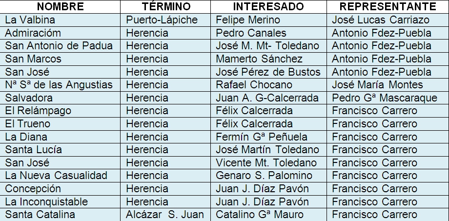 El cuadro donde se resume el nombre de esas minas, sus propietarios y representantes ante la Administración es el siguiente: