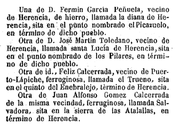 En 1855, el Boletín Oficial de la Provincia del 22 de Noviembre, se hace eco de la circular que el Gobernador Provincial, Don Ramón Cuervo, redacta en la que se determina la visita de los ingenieros Luís Natalio Monreal y Diego de la Viña para el “reconocimiento y demarcaciones de minas en esta provincia”. Unos días después, nos encontramos con el listado de las minas pertenecientes, entre otros, a los términos municipales de Puerto-Lápiche, Alcázar de San Juan y Herencia.