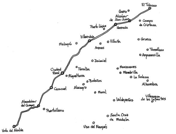 Obviamente el recorrido más racional para este desplazamiento era el Camino Real que posteriormente sería la base de la actual Nacional 420 y que de Campo de Criptana va a Puerto Lápice pasando, indiscutiblemente, por Alcázar de San Juan y Herencia.